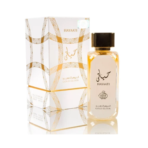 Hayaati Gold Elixir by Lattafa Perfumes is a fragrance for women and men. Top notes are Bergamot, Grapefruit and Cassis; middle notes are Leather, Peach and Saffron; base notes are Vanilla, Amber, Musk and Vetiver.